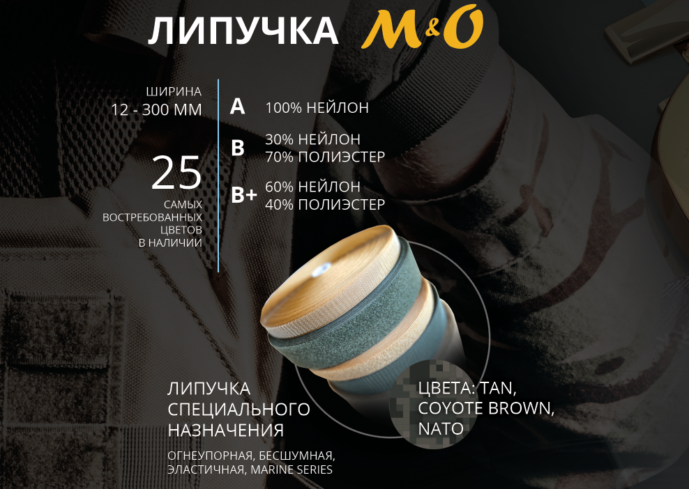 - M&O (Китай) — пришивные и самоклеящиеся липучки из смеси 70% полиэстера и 30% нейлона. Сочетание материалов обеспечивает хорошую износостойкость при доступной цене — оптимальный выбор для массового производства.